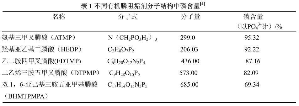 大分子有機膦阻垢劑分子結(jié)構(gòu)中,由于增加了-CH2-,分子量隨之增大,相對磷含量明顯降低;在-CH2-增加的同時,分子結(jié)構(gòu)中起關(guān)鍵阻垢作用的-PO(CH)2基團數(shù)量增加,阻垢性能得到顯著增強。不同有機膦阻垢劑分子機構(gòu)中磷含量見表 1。