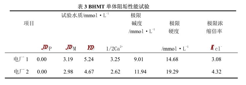 分別在選用的兩水樣中加入 BHMT 單體 6mg/L(按產(chǎn)品計)進(jìn)行阻垢性能試驗,試驗用水水質(zhì)及試驗結(jié)果見表 3。