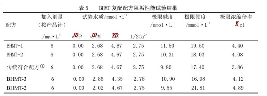 使用的有機膦類阻垢劑(ATMP、HEDP) 、羧基磷酸阻垢劑(PBTCA) 、聚合物分散劑、共聚物分散劑中的一種或多種阻垢劑。3 個符合配方(以下簡稱 BHMT-1,BHMT-2,BHMT-3)的 BHMT-1 中 BHMT含量較高, 約為 50% (質(zhì)量百分比, 下同) ; BHMT-2、 BHMT-3 中 BHMT 含量較低, 為 20%~30%; BHMT-1,BHMT-2,BHMT-3 中其它阻垢劑共 20%~50%;BHMT-1、BHMT-2、BHMT-3 固體含量相同,均約為 35%。試驗用水仍取自所選的 2 個火電廠,但由于季節(jié)影響,同一水源水質(zhì)較表 3、表 4 有所變化。試驗結(jié)見表5