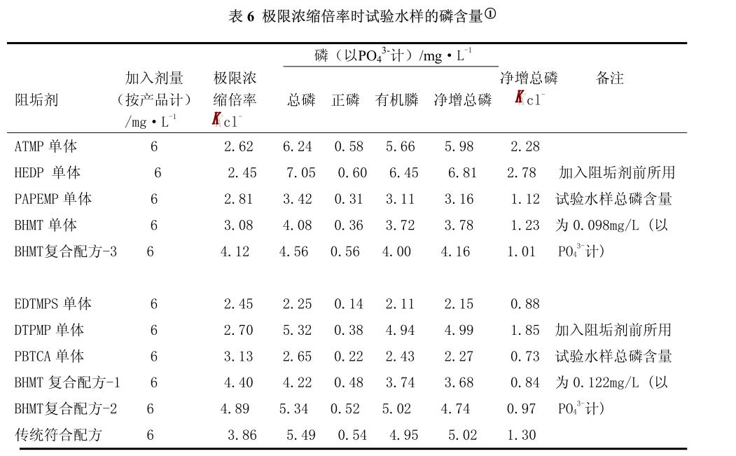 1.23mg/L(以PO 43- 計) ,與低磷阻垢劑PAPEMP相當(dāng),約為傳統(tǒng)有機膦阻垢劑ATMP、HEDP的 50%。復(fù)配配方中采用BHMT,濃縮倍率每提高 1.0 磷含量增加值較傳統(tǒng)有機膦復(fù)配配方降低 30%~50%。
